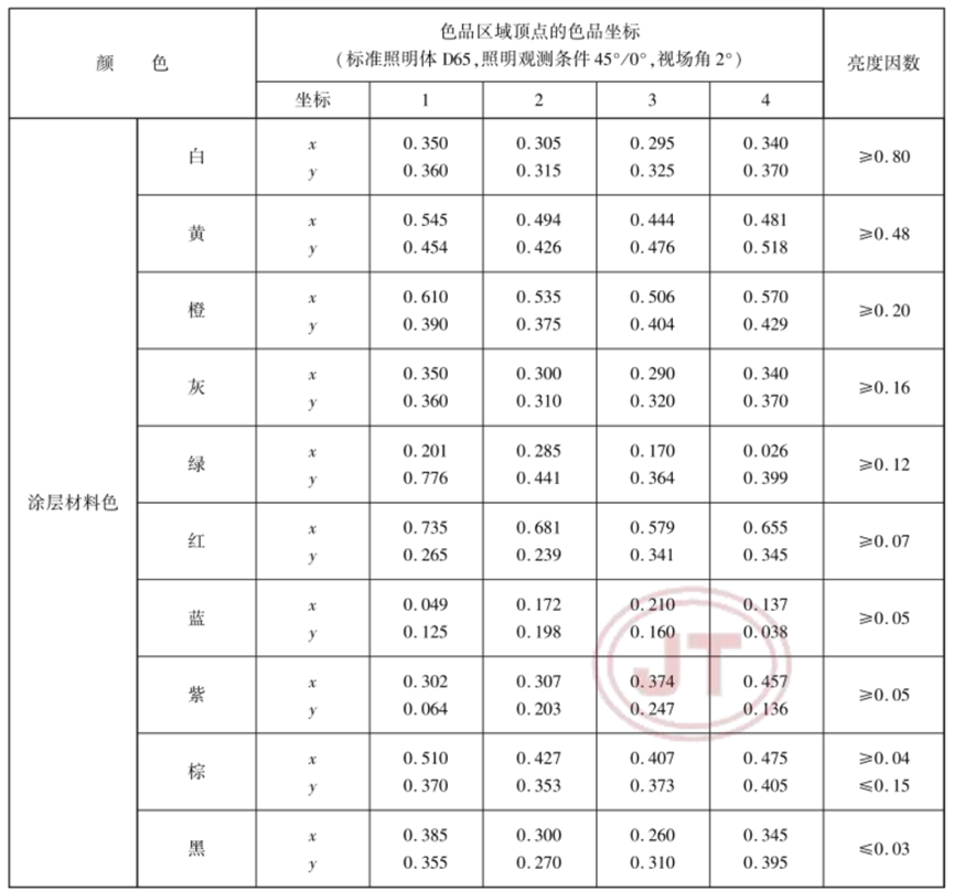 1.5 增加了溶剂型、水性路面标线涂料“人工加速耐候性”技术要求:试验前样品的色品坐标和亮度因数应符合表2和图1的规定。经人工加速耐候性试验后,试板涂层不产生龟裂、剥落;允许轻微粉化和变色,色品坐标应符合表2和图1的规定,涂层亮度因数变化范围应不大于表2中规定的亮度因数的20%。
